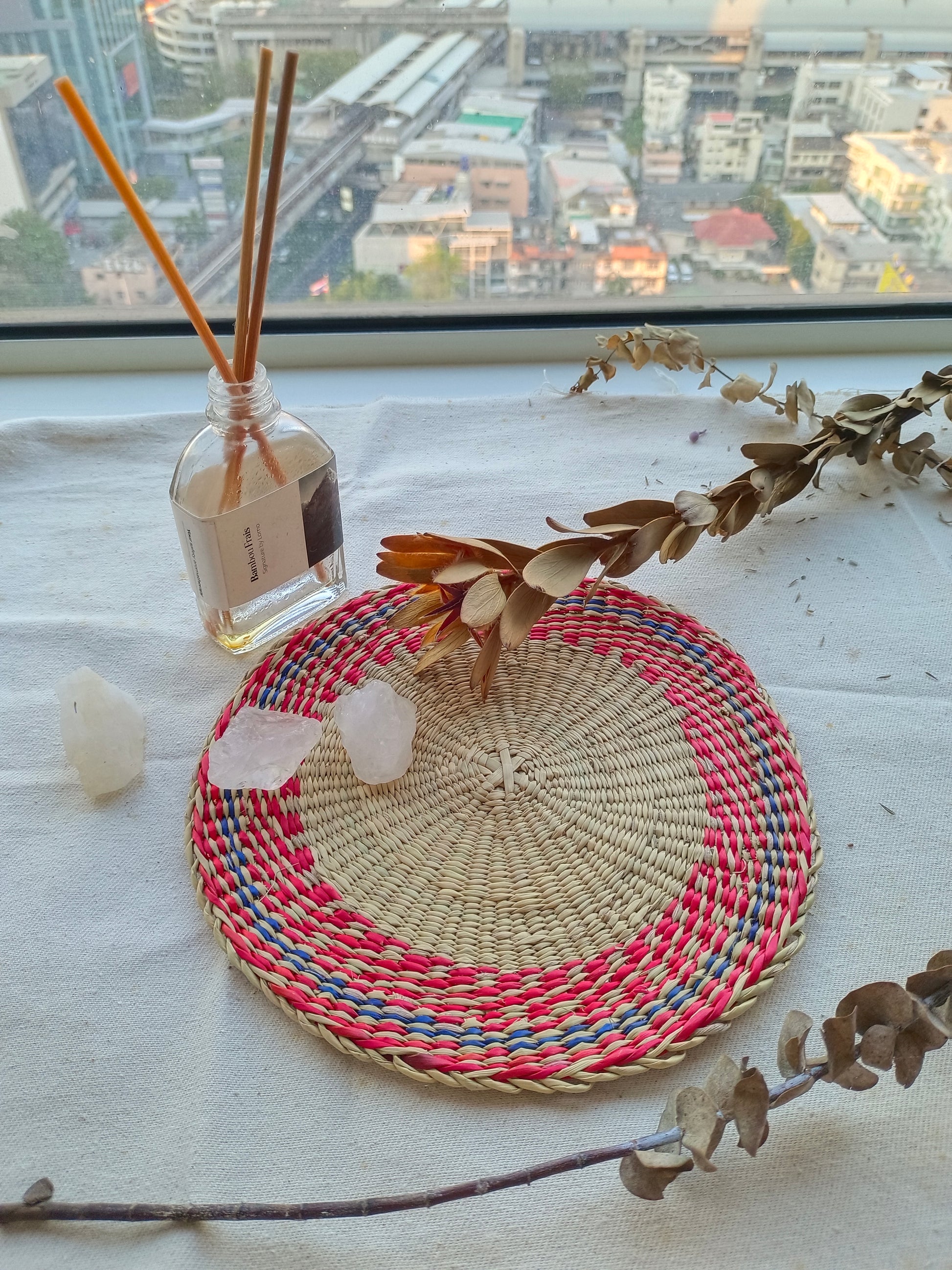 This natural sedge is carefully handwoven by Thai artisans, pouring generations of local wisdom and craftsmanship. A modern take on traditional Thai weaves that adds cultural sophistication to any home. We use natural sedge and redesign the colour and pattern in order to harmonize with modern lifestyle. This placemat set can be use with hot or cold drink. It easily match with special serving set for every home. It helps protecting from scratch, water stain on the table. The difference of mat colour would help identify individual plate from confusion.