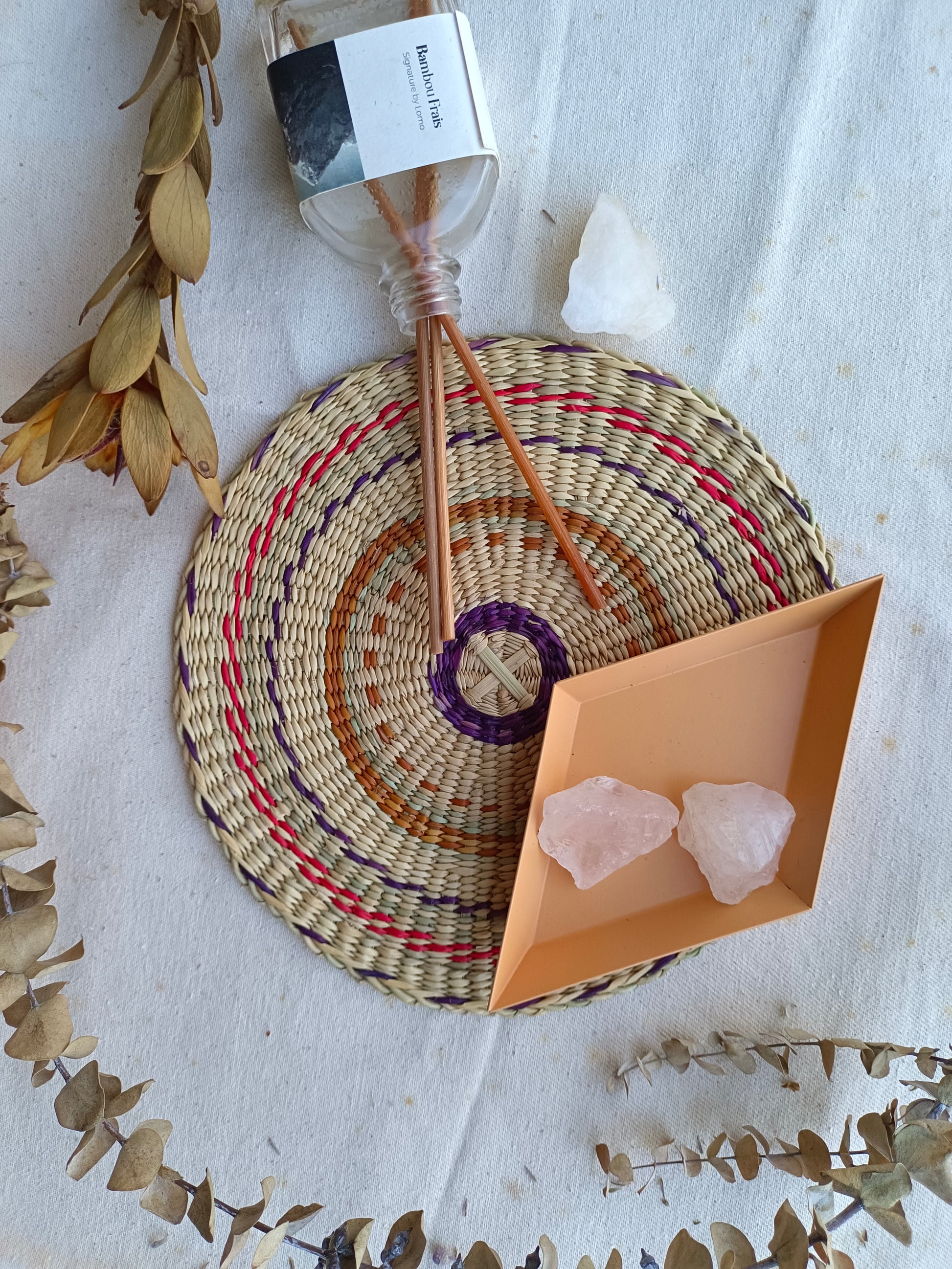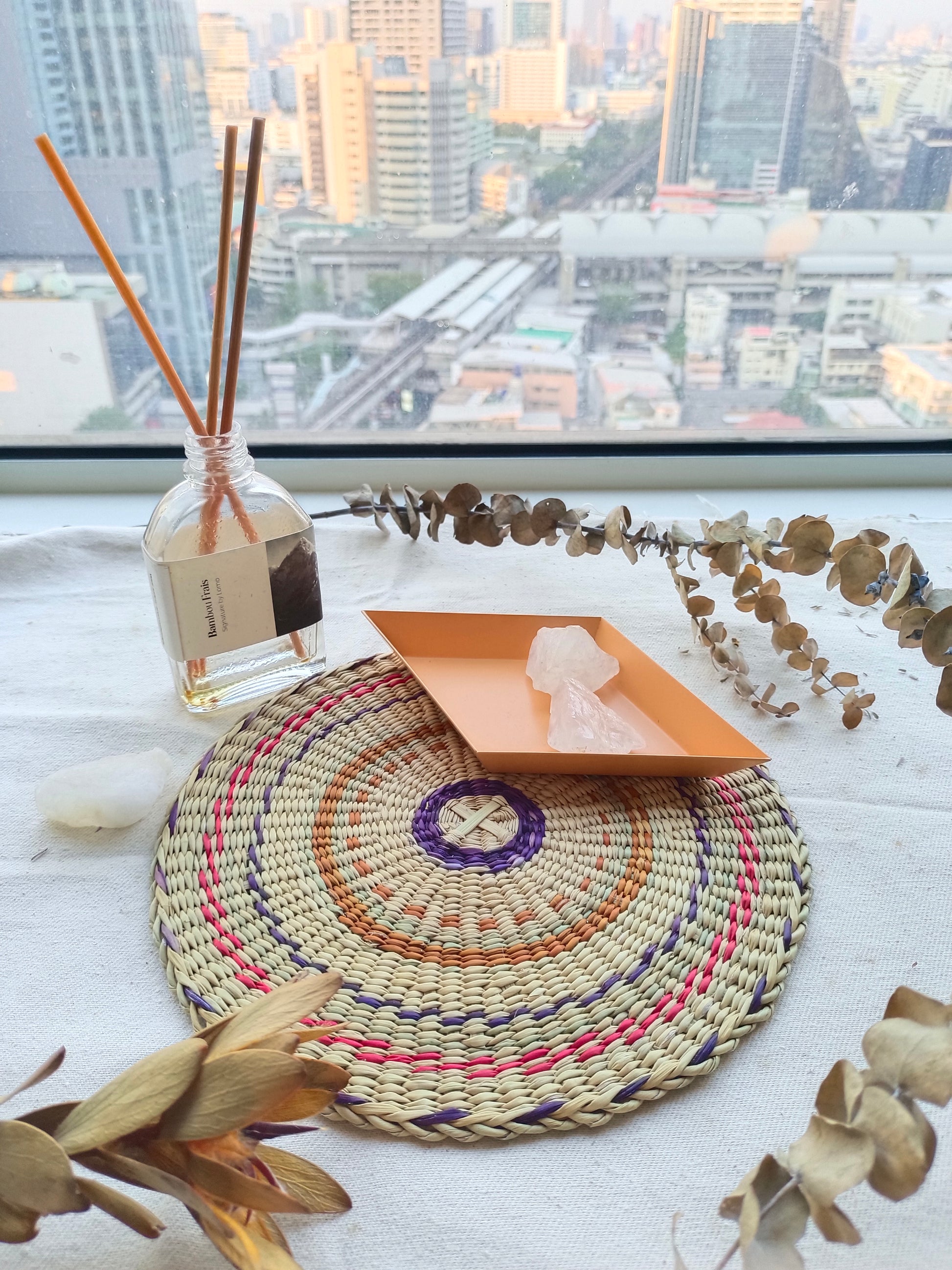 This natural sedge is carefully handwoven by Thai artisans, pouring generations of local wisdom and craftsmanship. A modern take on traditional Thai weaves that adds cultural sophistication to any home. We use natural sedge and redesign the colour and pattern in order to harmonize with modern lifestyle. This placemat set can be use with hot or cold drink. It easily match with special serving set for every home. It helps protecting from scratch, water stain on the table. The difference of mat colour would help identify individual plate from confusion.